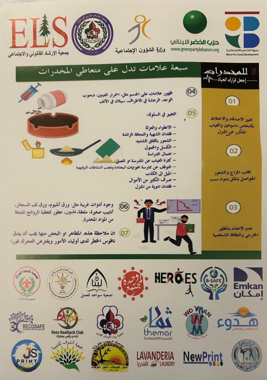 :"في إطار الحملة الوطنية "لا للمخدرات، اجعل قرارك الحياة Wo-Man Together نهار السبت 19 تموز 2025، شاركت جمعية في الحملة الوطنية التي نظّمتها الجمعيات المدنية اللبنانية في كل المحافظات اللبنانية، بهدف نشر الوعي حول مخاطر المخدرات وتعزيز الثقافة الوقائية في المجتمع أقامت الجمعية حواجز محبّة في منطقتي أنطلياس وجونية، حيث تم توزيع منشورات توعوية على المارة،..